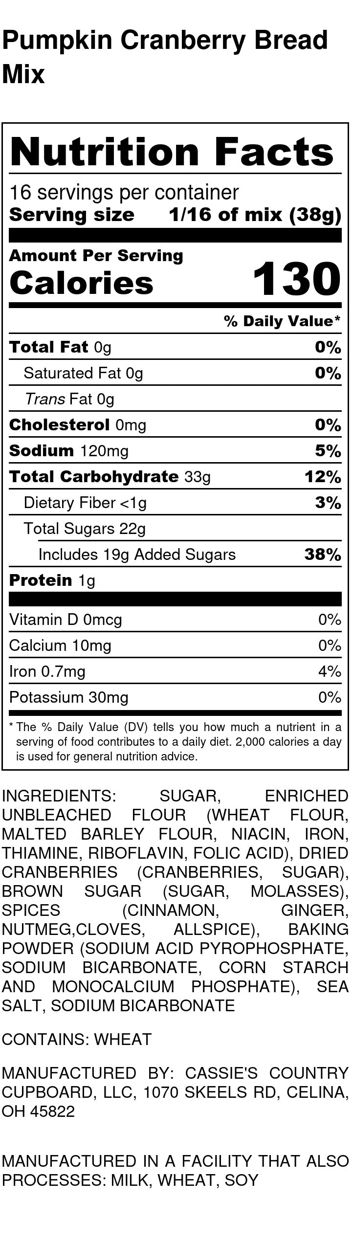 Ingredients: flour (unbleached wheat flour, malted barley flour, niacin, iron reduced, thiamine mononitrate, riboflavin, folic acid), sugar, dried cranberries (cranberries, sugar), brown sugar (sugar, molasses), spices, salt, baking powder (sodium acid pyrophosphate, sodium bicarbonate, cornstarch and monocalcium phosphate), sodium bicarbonate